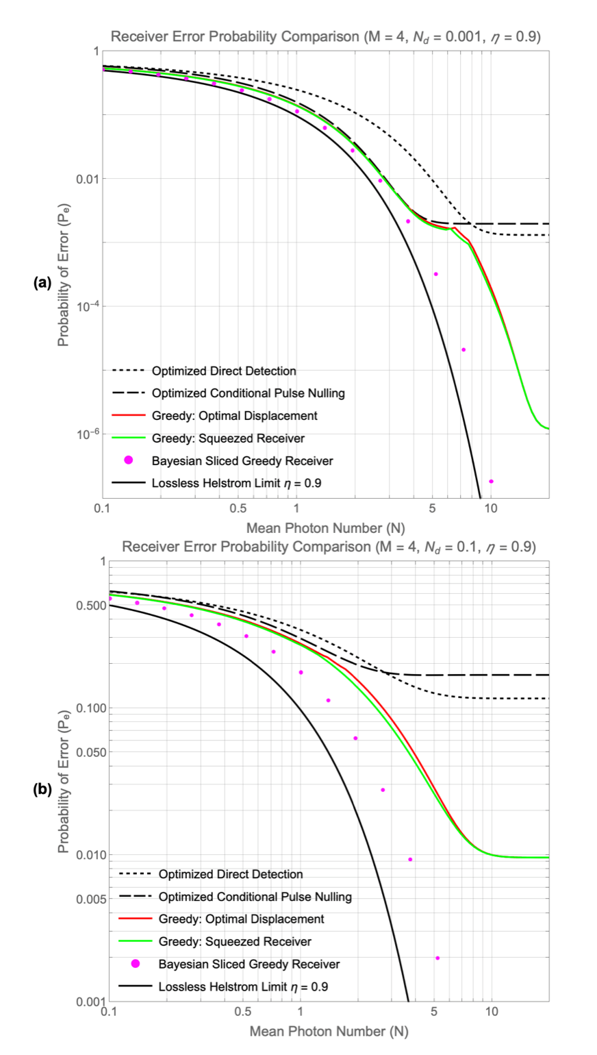 In “Bayesian Greedy Receiver for Pulse Position Modulation without an Error Floor under Thermal Noise” we examine quantum receiver architectures for demodulation of M-ary Pulse Position Modulation under thermal noise and photon-starved conditions. Building on the greed receiver framework, we analyze it using jointly optimized displacement-squeezing and the Dolinar receiver. We further introduce a novel slicing Bayesian greedy receiver, which partitions each PPM time slot into multiple optical slices and update the full posterior distribution over codeword hypothesis at each slice using Bayes’ rule. Under the presence of noise, our slicing greedy receiver outperforms the standard greedy receiver and appears to avoid a noise floor given sufficient slicing resolution.